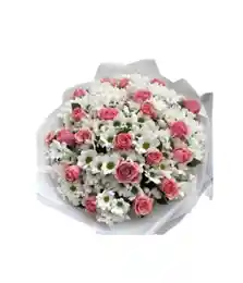 Bouquet de 2 paquetes de margarita blanca y 24 rosas rosadas Nota: La flor puede ser sustituida dependiendo la disponibilidad de color y del producto “Mensaje Personalizado” máximo de 30 caracteres (Dejar el mensaje en el chat, los comentarios no se previsualizan para la tienda por lo que si se dejan allí no podrá ser incluido).