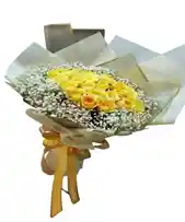 Bouquet de 12-18 rosas amarillas aproximadamente con gypsophila. La flor puede ser sustituida dependiendo la disponibilidad de color y del producto “Mensaje Personalizado” máximo de 30 caracteres (Dejar el mensaje en el chat, los comentarios no se previsualizan para la tienda por lo que si se dejan allí no podrá ser incluido)