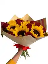 Bouquet de 20 rosas rojas con 6 girasoles Nota: La flor puede ser sustituida dependiendo la disponibilidad de color y del producto “Mensaje Personalizado” máximo de 30 caracteres (Dejar el mensaje en el chat, los comentarios no se previsualizan para la tienda por lo que si se dejan allí no podrá ser incluido).