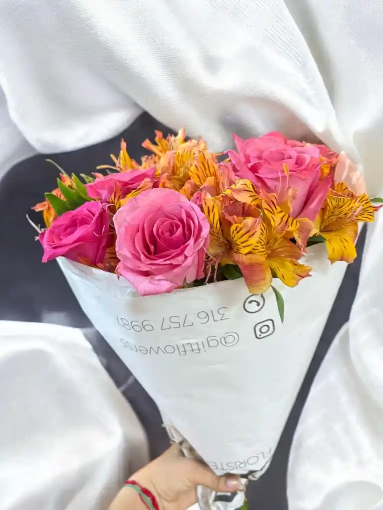 Bouquet de 6 rosas rosada con astromelia naranja. Nota: La flor puede ser sustituida dependiendo la disponibilidad de color y del producto “Mensaje Personalizado” máximo de 30 caracteres (Dejar el mensaje en el chat, los comentarios no se previsualizan para la tienda por lo que si se dejan allí no podrá ser incluido).