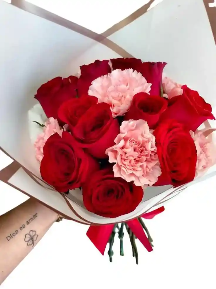 Bouquet de 11 rosas rojas con 6 claveles rosas Nota: La flor puede ser sustituida dependiendo la disponibilidad de color y del producto “Mensaje Personalizado” máximo de 30 caracteres (Dejar el mensaje en el chat, los comentarios no se previsualizan para la tienda por lo que si se dejan allí no podrá ser incluido).