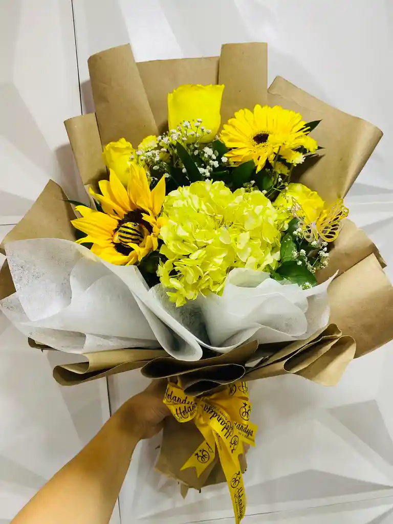 bouquet en papel kraf con girasol y pompom envoltura fina