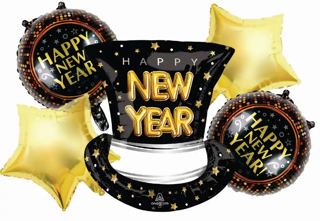 Bouquet Feliz Año Sombrero, viene con 5 globos que incluyen: 1 globos metalizado de Sombrero, 2 globos metaliz...Ver más