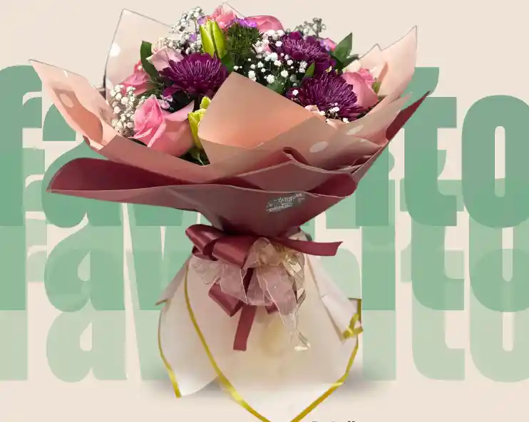 Detalles: ROSAS, LIRIOS, CREMONES. SELECCIÓN DE FLORES Y FOLLAJES A COMBINACIÓN. DECORACIÓN EN PAPEL COREANO Y MOÑO.