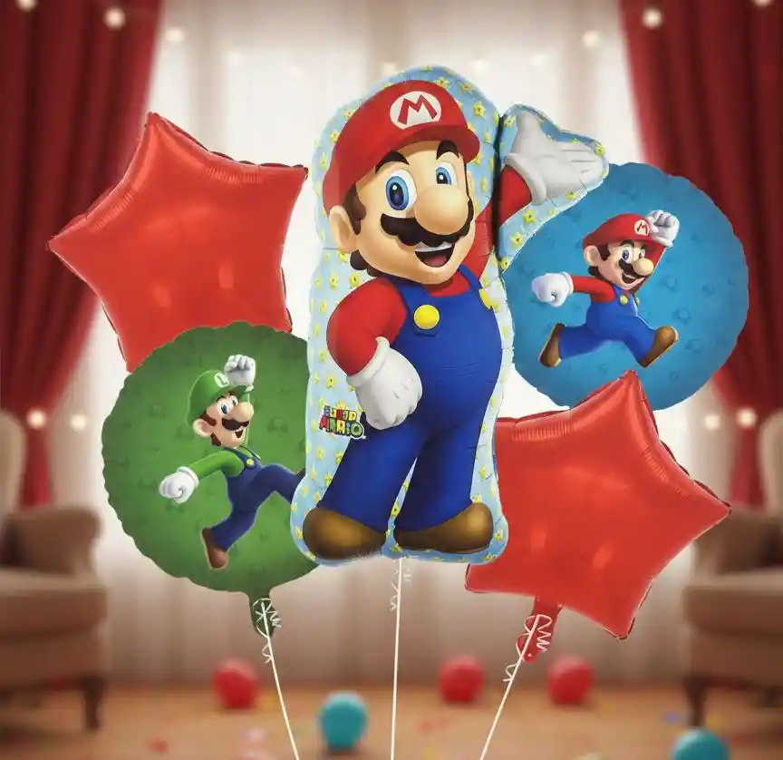 🍄🎈 BOUQUET DE GLOBOS PERSONAJE INFANTIL SUPER MARIO BROS X5 🎈🍄