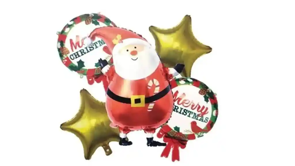 Buquet de 5 globos perfectos para tu decoración Navideña contenido del paquete: 1 Globo papa noel 73 cm 2 Globos de estrella de 45 cm 2 globos redodndos merry christmas 63 cm Disponibilidad inmediata nota: los globos se envían sin inflar