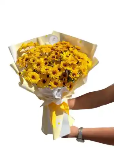 Bouquet de margaritas amarillas. La flor puede ser sustituida dependiendo la disponibilidad de color y del producto “Mensaje Personalizado” máximo de 30 caracteres (Dejar el mensaje en el chat, los comentarios no se previsualizan para la tienda por lo que si se dejan allí no podrá ser incluido).