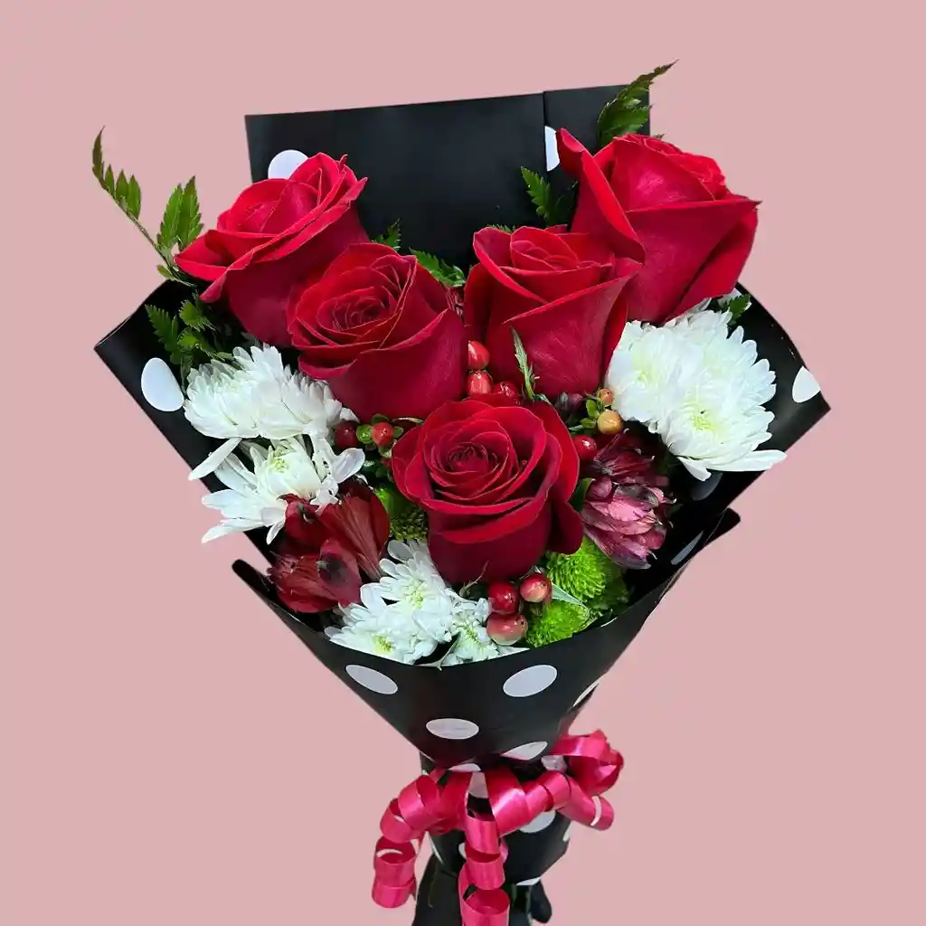 Este cautivador arreglo está protagonizado por cinco de rosas rojas, que se alzan majestuosas en el centro de la composición. Se complementan armoniosamente con la frescura de flores y toques de follaje verde intenso, que aportan contraste y una sensación de plenitud. Pequeños acentos de bayas rojas y flores adicionales en tonos complementarios añaden textura y profundidad visual. El bouquet se presenta en un moderno papel coreano que realza la intensidad del rojo y la pureza del blanco. Un lazo de cinta fucsia, con su diseño juguetón y rizado, sella este regalo, añadiendo un toque vibrante y juvenil. Ideal para aniversarios, para expresar un amor apasionado o para celebrar cualquier ocasión especial con un toque de sofisticación y audacia, este mini bouquet es la elección perfecta para dejar una impresión inolvidable.