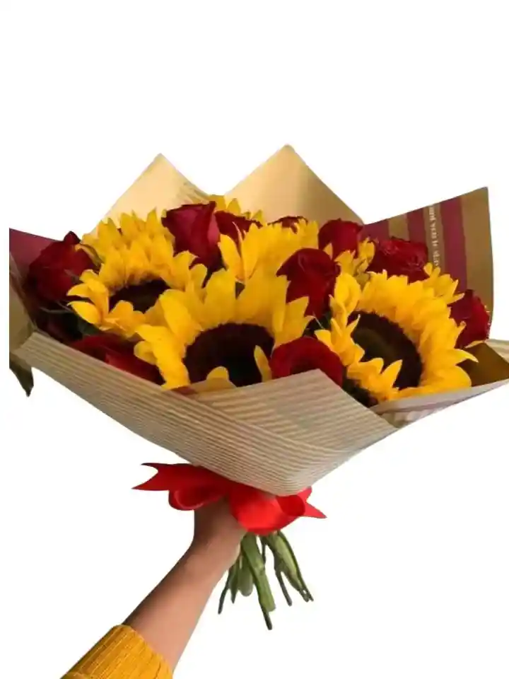 Bouquet de 20 rosas rojas con 6 girasoles Nota: La flor puede ser sustituida dependiendo la disponibilidad de color y del producto “Mensaje Personalizado” máximo de 30 caracteres (Dejar el mensaje en el chat, los comentarios no se previsualizan para la tienda por lo que si se dejan allí no podrá ser incluido).