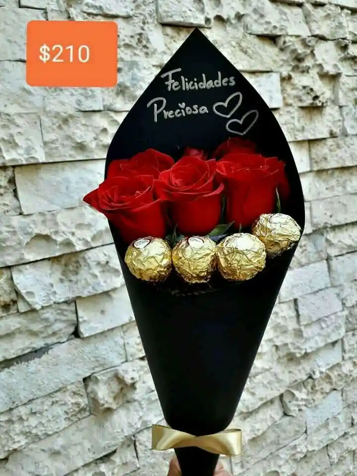 Un encantador bouquet con rosas frescas y un toque de dulzura con chocolates. Ideal para sorprender en cualquier ocasión especial. Nota: La flor puede ser sustituida dependiendo de la disponibilidad de color y del producto. "Mensaje Personalizado" máximo de 30 caracteres (Dejar el mensaje en el chat, los comentarios no se previsualizan para la tienda, por lo que si se dejan allí no podrá ser incluido).