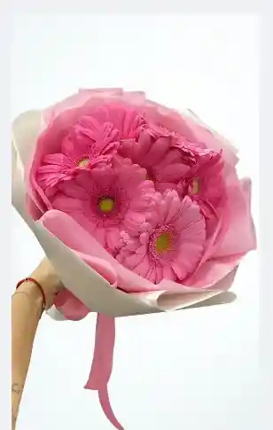 Bouquet con aprox. 7 gerberas rosadas. Nota: La flor puede ser sustituida dependiendo la disponibilidad de color y del producto “Mensaje Personalizado” máximo de 30 caracteres (Dejar el mensaje en el chat, los comentarios no se previsualizan para la tienda por lo que si se dejan allí no podrá ser incluido).
