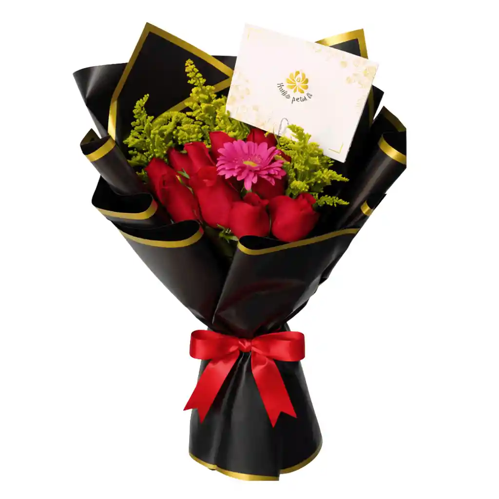 Un detalle fresco y colorido que transmite alegría y amor en cada flor 🌸. Incluye un bouquet con doce rosas y gerberas adornado con follaje fresco y papel fino, terminado con un moño decorativo. Si nos envías tu mensaje, te obsequiamos la tarjeta personalizada para expresar tus sentimientos de manera única ✨. REF: FLW05