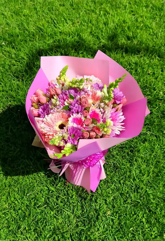 Bouquet surtido con gerberas, rosas, boca de dragón y margaritas