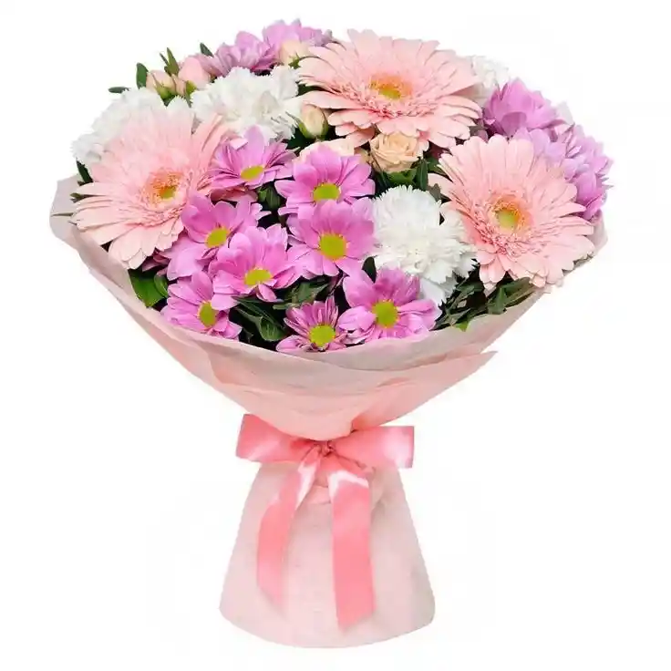 Un arreglo tierno, fresco y lleno de luz. Este bouquet combina gerberas rosadas, margaritas en tonos lila, claveles blancos y follaje verde que resalta cada flor. Envuelto en papel rosa pastel y terminado con un lazo satinado, es un regalo que transmite cariño, gratitud y pureza. 🎁 Ideal para: Cumpleaños, agradecimientos, aniversarios, detalles románticos o regalos para amigas.