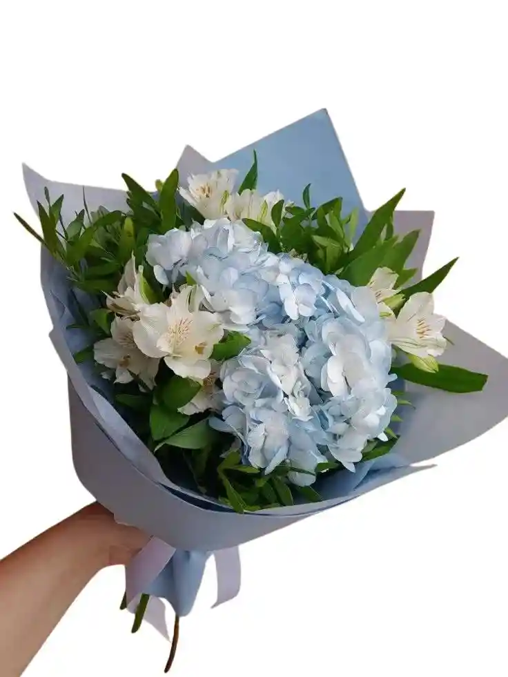 Bouquet de 2 hortencias azules con 1 paquete de astromelia blanca Nota: La flor puede ser sustituida dependiendo la disponibilidad de color y del producto “Mensaje Personalizado” máximo de 30 caracteres (Dejar el mensaje en el chat, los comentarios no se previsualizan para la tienda por lo que si se dejan allí no podrá ser incluido).