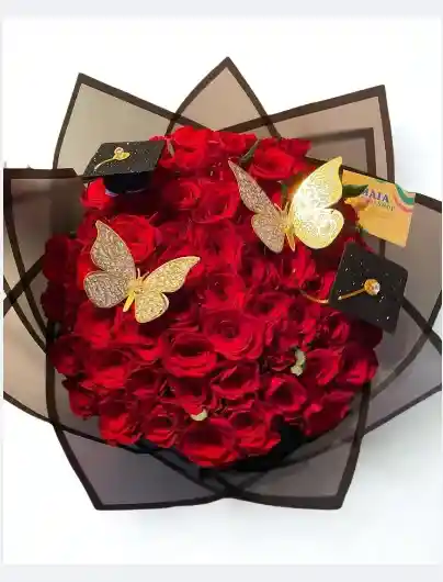 Buchon con aprox. 50 rosas rojas y mariposas. Nota: La flor puede ser sustituida dependiendo la disponibilidad de color y del producto “Mensaje Personalizado” máximo de 30 caracteres (Dejar el mensaje en el chat, los comentarios no se previsualizan para la tienda por lo que si se dejan allí no podrá ser incluido).
