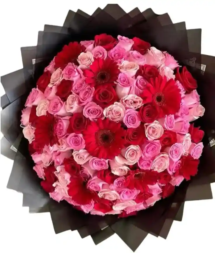 Buchon mix de 40 rosas entre rosadas y rojas con 9 gerberas rojas Nota: La flor puede ser sustituida dependiendo la disponibilidad de color y del producto “Mensaje Personalizado” máximo de 30 caracteres (Dejar el mensaje en el chat, los comentarios no se previsualizan para la tienda por lo que si se dejan allí no podrá ser incluido).