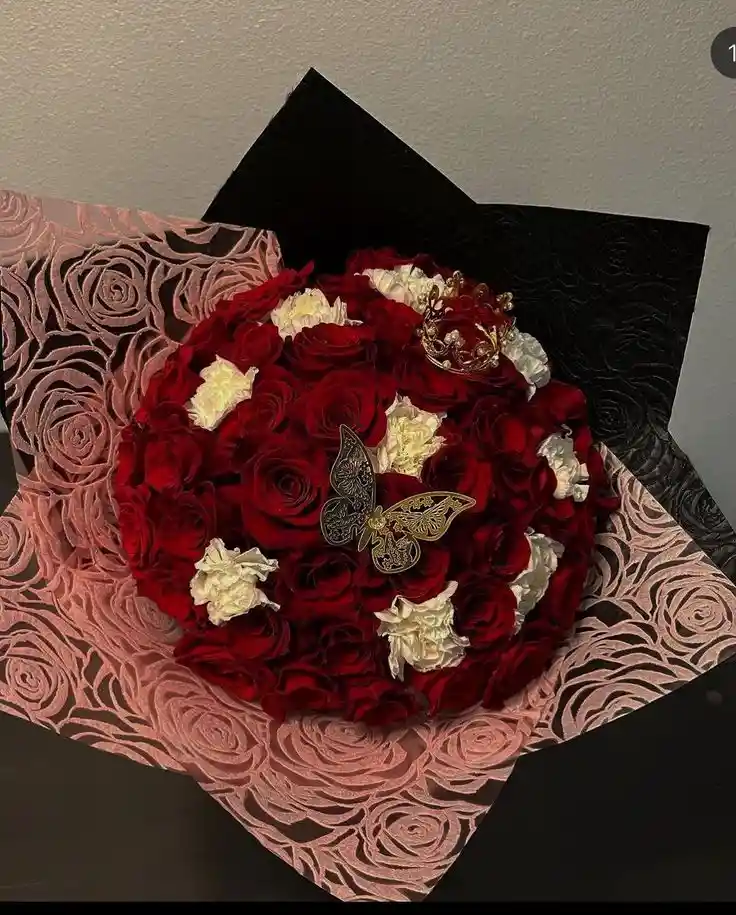 Buchon de 50 rosas rojas y 10 claveles blanco Nota: La flor puede ser sustituida dependiendo la disponibilidad de color y del producto “Mensaje Personalizado” máximo de 30 caracteres (Dejar el mensaje en el chat, los comentarios no se previsualizan para la tienda por lo que si se dejan allí no podrá ser incluido).