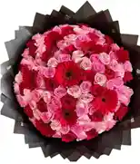Buchon mix de 40 rosas entre rosadas y rojas con 9 gerberas rojas Nota: La flor puede ser sustituida dependiendo la disponibilidad de color y del producto “Mensaje Personalizado” máximo de 30 caracteres (Dejar el mensaje en el chat, los comentarios no se previsualizan para la tienda por lo que si se dejan allí no podrá ser incluido).