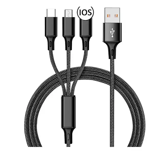 Características: -Color: Negro - Nombre del producto: Cable 3 en 1 - Longitud: 1,2 m - Colores: rojo/Negro/azul - Estilo: moderno y portátil -Compatible: Android Micro -Material: nailon trenzado + cabezales de aluminio - Ventaja: Ultra duradero - Característica: carga 3 teléfonos a la vez USB/para iPhone/Tipo C