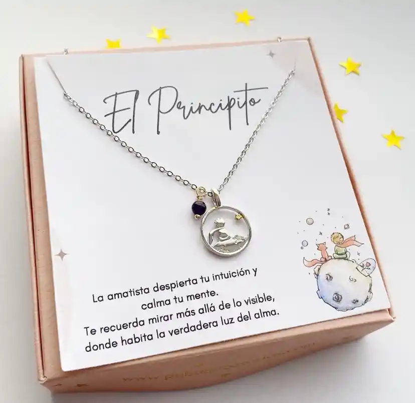 CR1-2 💜 Cadena Amatista – “Sabiduría del Alma” Inspirada en “Solo se ve bien con el corazón”. La amatista aporta calma e intuición, y la estrella fugaz simboliza guía interior. Un collar para quienes buscan claridad y paz.