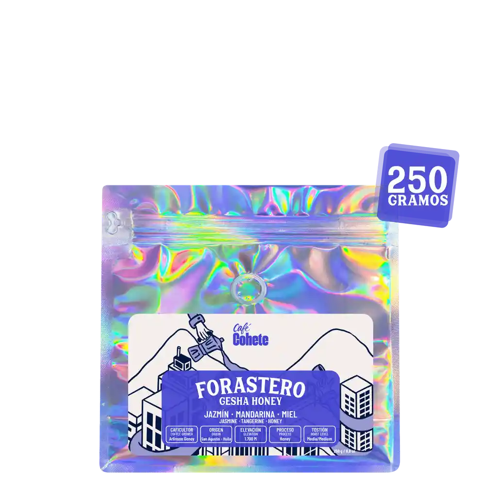 Nuestro café especial de temporada Gesha Honey (Forastero) tiene deliciosas notas a jazmín, mandarina y miel. DESCRIPCIÓN DEL CAFÉ FORASTERO Caficultora: Arlinson Genoy. Origen: San Agustín, Huila. Variedad: Gesha. Proceso: Honey. Fermentación: 48 horas. Altitud: 1.700 m.s.n.m. Perfil de taza: Jazmín, mandarina y miel. Cuerpo: Ligero. Acidez: Cítrica. Tostión: Media. Notificación sanitaria: NSA-0013394-2023.