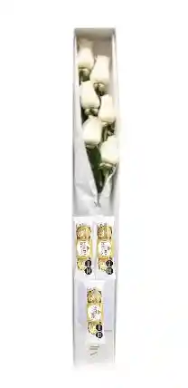 Caja Contiene 6 Rosas Blancas. Decorada con Follaje, Papel y Moño y 9 chocolates