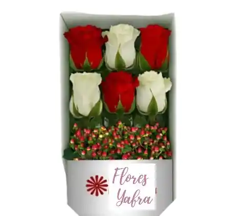 Caja Contiene 6 Rosas Blancas y rojas. Decorada con Follaje, Papel y Moño