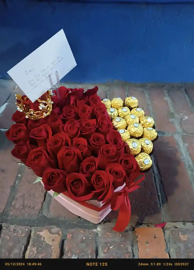 CAJA EN FORMA DE CORAZON CON ROSAS ROJAS CON CHOCOLATES FERREROS Y CORONITA