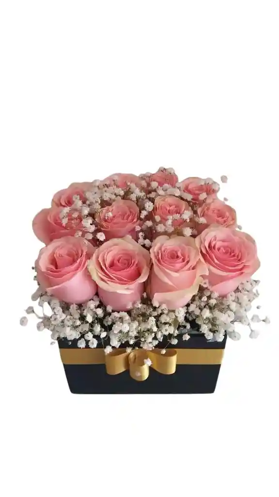 Caja de 12 rosas rosadas con gypsophila Nota: La flor puede ser sustituida dependiendo la disponibilidad de color y del producto “Mensaje Personalizado” máximo de 30 caracteres (Dejar el mensaje en el chat, los comentarios no se previsualizan para la tienda por lo que si se dejan allí no podrá ser incluido).