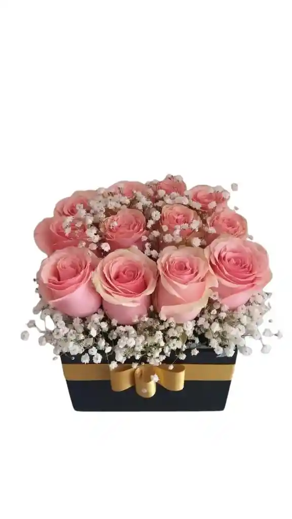 Caja de 12 rosas rosadas con gypsophila Nota: La flor puede ser sustituida dependiendo la disponibilidad de color y del producto “Mensaje Personalizado” máximo de 30 caracteres (Dejar el mensaje en el chat, los comentarios no se previsualizan para la tienda por lo que si se dejan allí no podrá ser incluido).