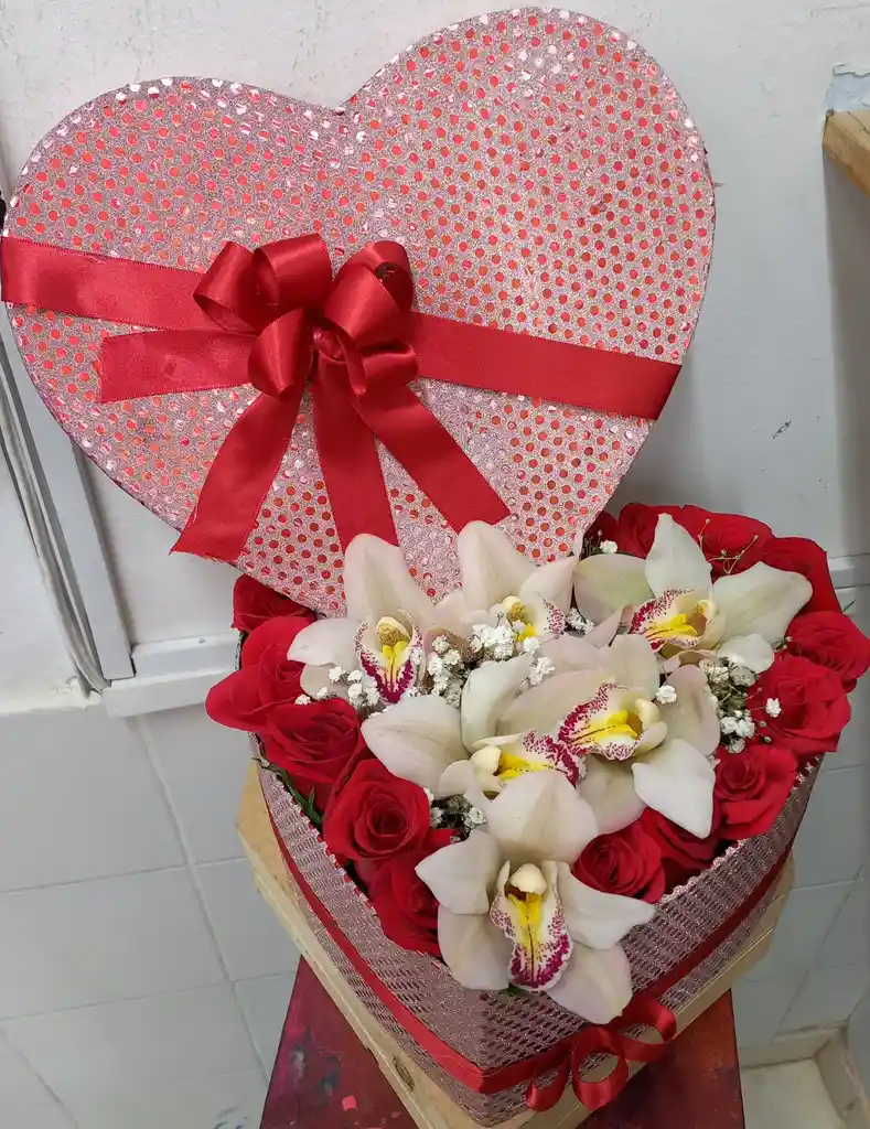 Caja con girasol, rosas, 3 chocolates Ferrero, yipso y moño