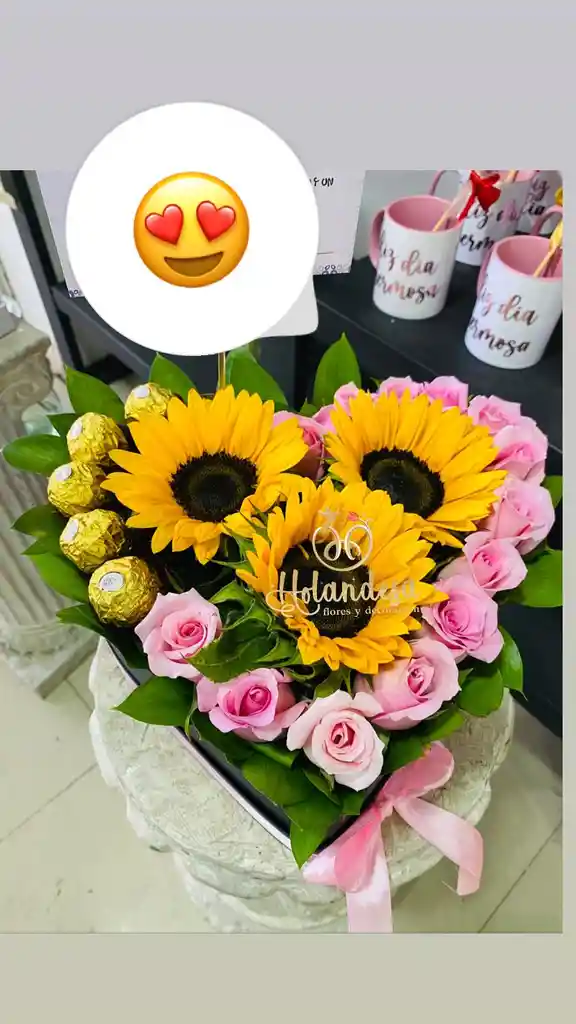 caja corazon en rosas color segun disponibilidad , girasoles y ferrero * 5