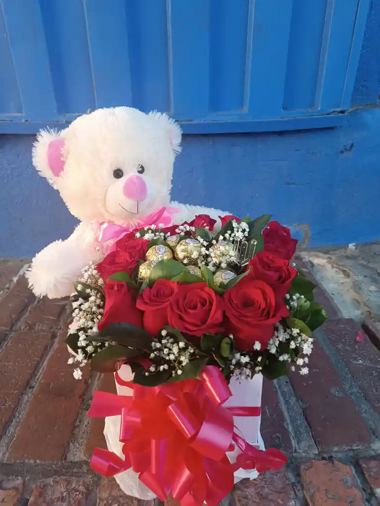 CAJA DE ROSAS CON CHOCOLATES FERREROS, ROSAS Y OSO DE PELUCHE
