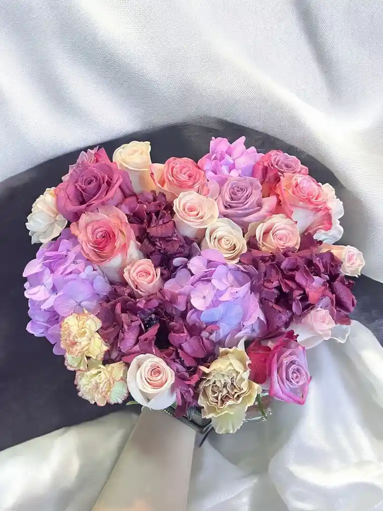 Caja de corazon de flores pasteñ, hortensias, rosas, claveles. Nota: La flor puede ser sustituida dependiendo la disponibilidad de color y del producto “Mensaje Personalizado” máximo de 30 caracteres (Dejar el mensaje en el chat, los comentarios no se previsualizan para la tienda por lo que si se dejan allí no podrá ser incluido).