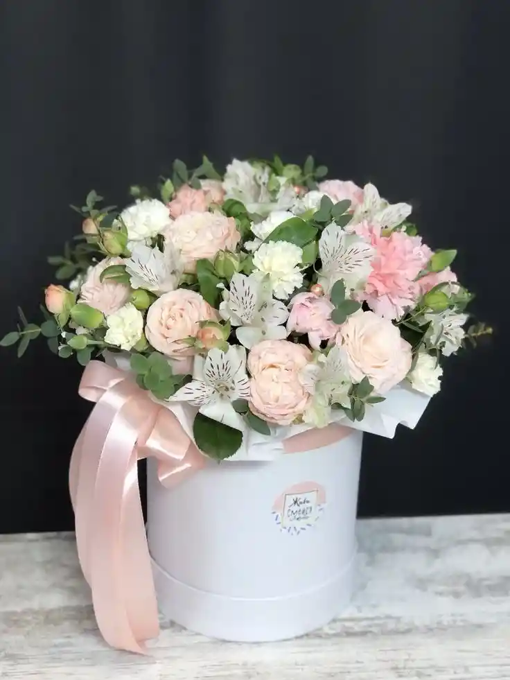 Un delicado arreglo floral que combina rosas en suaves tonos durazno y crema con alstroemerias blancas y toques de follaje fresco. Presentado en una elegante caja blanca adornada con un lazo satinado en rosa pastel, transmite dulzura y serenidad. Es el regalo ideal para expresar ternura, gratitud o simplemente iluminar un espacio con su belleza romántica y atemporal.