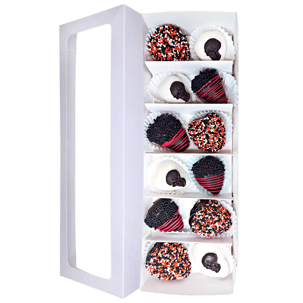 Caja de 12 fresas con chocolate decoradas: Calaveras de chocolate, grageas comestibles. Ideal para celebrar la noche de Halloween