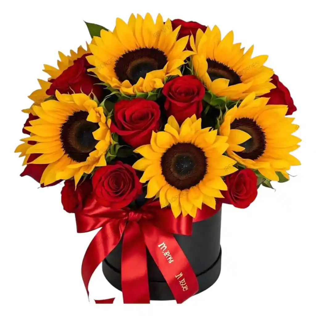 Caja floral con 6 unidades de girasoles con 12 unidades de rosas rojas.