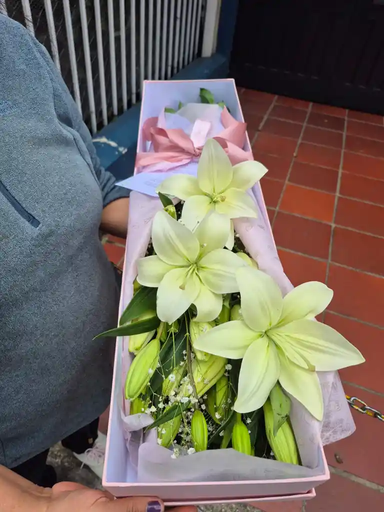Caja alargada tradicional de lirios o (lilis) con follajes. Especial para regalar de de en cumpleaños, celebración de aniversarios o solo por que si. Si deseas alguna tarjeta ( mensaje ) escribirlo en los comentarios o escríbenos