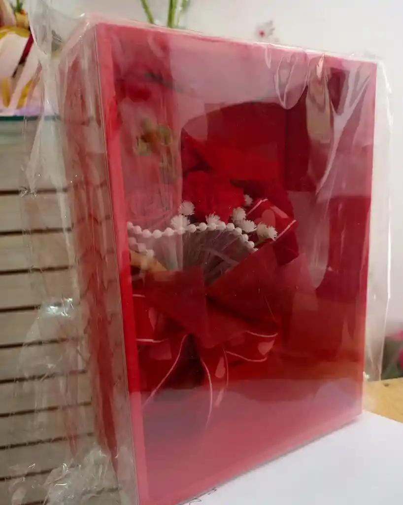 "¡Un detalle que dura para siempre! ❤️ Esta elegante Caja de Lujo color rojo vibrante contiene un delicado arreglo de flores artificiales premium (rosas y claveles) que mantendrán su belleza por años. 🌹 son flores artificiales