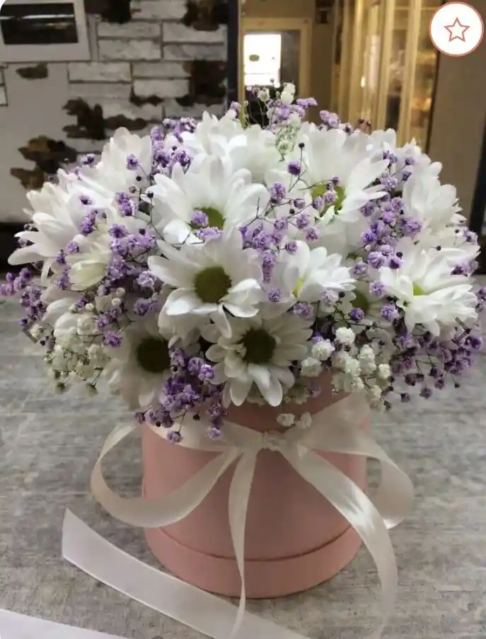 Caja de 2 a 3 paquetes de margarita blanca y gypsophila morada Nota: La flor puede ser sustituida dependiendo la disponibilidad de color y del producto “Mensaje Personalizado” máximo de 30 caracteres (Dejar el mensaje en el chat, los comentarios no se previsualizan para la tienda por lo que si se dejan allí no podrá ser incluido).