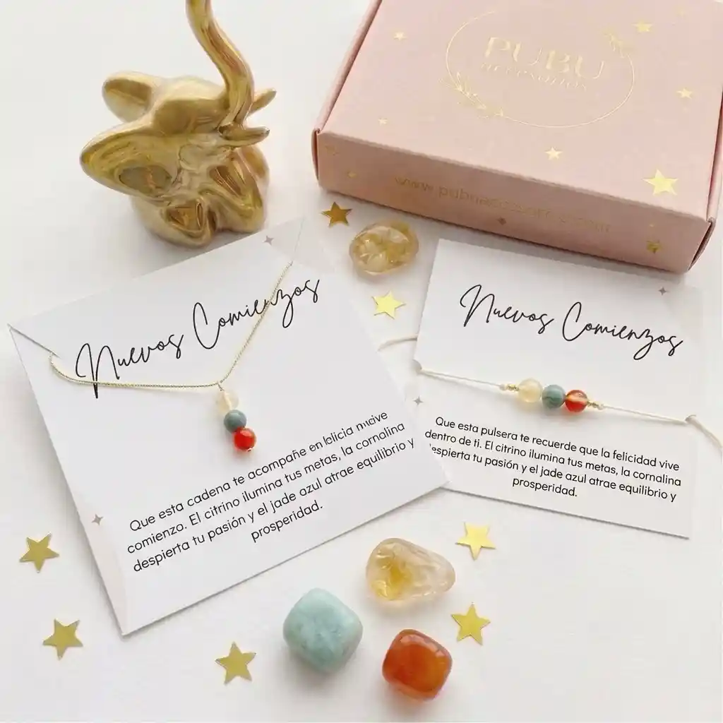 PM1-2/C38-15 Set Nuevos Comienzos - Collar Acero y Pulsera de Intención ¡El impulso que necesitas para tus metas! Este set de collar y pulsera está diseñado para acompañarte en cada etapa de cambio, combinando la resistencia del acero con el poder de las piedras naturales. • Material: Cadena en acero inoxidable de alta calidad (no se oxida). • Piedras Naturales: Citrino (metas), Cornalina (pasión) y Jade Azul (equilibrio y prosperidad). • Significado: Incluye tarjeta con mensaje inspirador sobre la felicidad y el éxito en los nuevos proyectos. • Presentación: Se entrega en caja de regalo, listo para obsequiar o para un autoregalo especial. ¡Empieza tu nueva etapa con toda la energía y estilo!