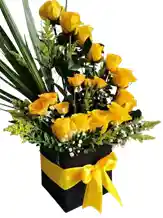 Caja cuadrada en forma de cascada de rosas amarillas (aproximadamente 12 rosas). La flor puede ser sustituida dependiendo la disponibilidad de color y del producto “Mensaje Personalizado” máximo de 30 caracteres (Dejar el mensaje en el chat, los comentarios no se previsualizan para la tienda por lo que si se dejan allí no podrá ser incluido).