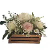 Caja de 3 rosas rosadas y 2 claveles blancos y gypsophila con rusco Nota: La flor puede ser sustituida dependiendo la disponibilidad de color y del producto “Mensaje Personalizado” máximo de 30 caracteres (Dejar el mensaje en el chat, los comentarios no se previsualizan para la tienda por lo que si se dejan allí no podrá ser incluido).