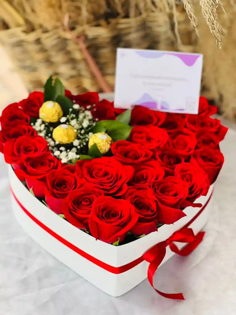 CAJA CORAZON DE 24 UNIDADES DE ROSAS en color segun disponibiliad , 3 UNIDADES DE FERRERO, MOÑO EN CINTA TELA (COLOR DE LA CAJA VARIA SEGUN DISPONIBILIDAD)