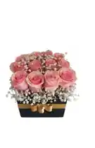 Caja de 12 rosas rosadas con gypsophila Nota: La flor puede ser sustituida dependiendo la disponibilidad de color y del producto “Mensaje Personalizado” máximo de 30 caracteres (Dejar el mensaje en el chat, los comentarios no se previsualizan para la tienda por lo que si se dejan allí no podrá ser incluido).