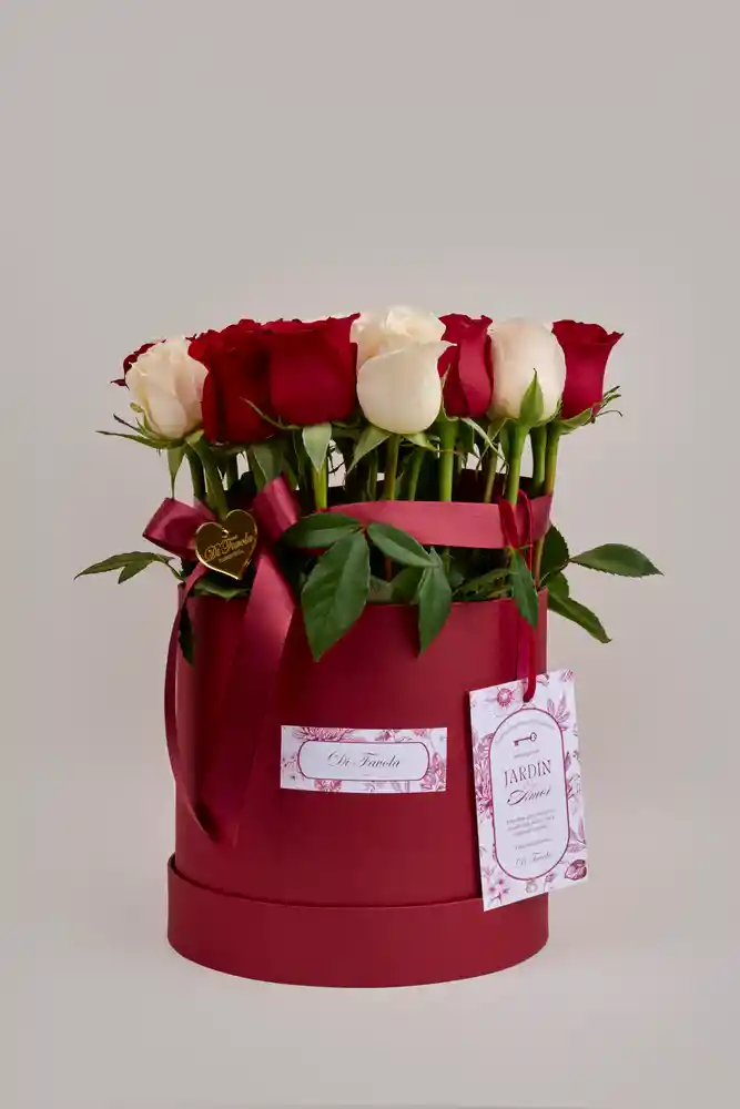 Cilindro floral elaborado con veinticuatro rosas de exportación en tonos rojos y marfil, cuidadosamente seleccionadas para crear un diseño equilibrado y lleno de intención. Una pieza elegante que representa el amor elegido, expresado a través de flores frescas y un diseño limpio. Incluye: - Arreglo floral - Instrucciones de cuidado - Tarjeta dedicatoria - Tarjeta especial edición San Valentín Jardín de Amor con cinta velvet y corazón acrílico de lujo
