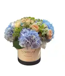Caja de 12 rosas y 4 hortencias azules Nota: La flor puede ser sustituida dependiendo la disponibilidad de color y del producto “Mensaje Personalizado” máximo de 30 caracteres (Dejar el mensaje en el chat, los comentarios no se previsualizan para la tienda por lo que si se dejan allí no podrá ser incluido).