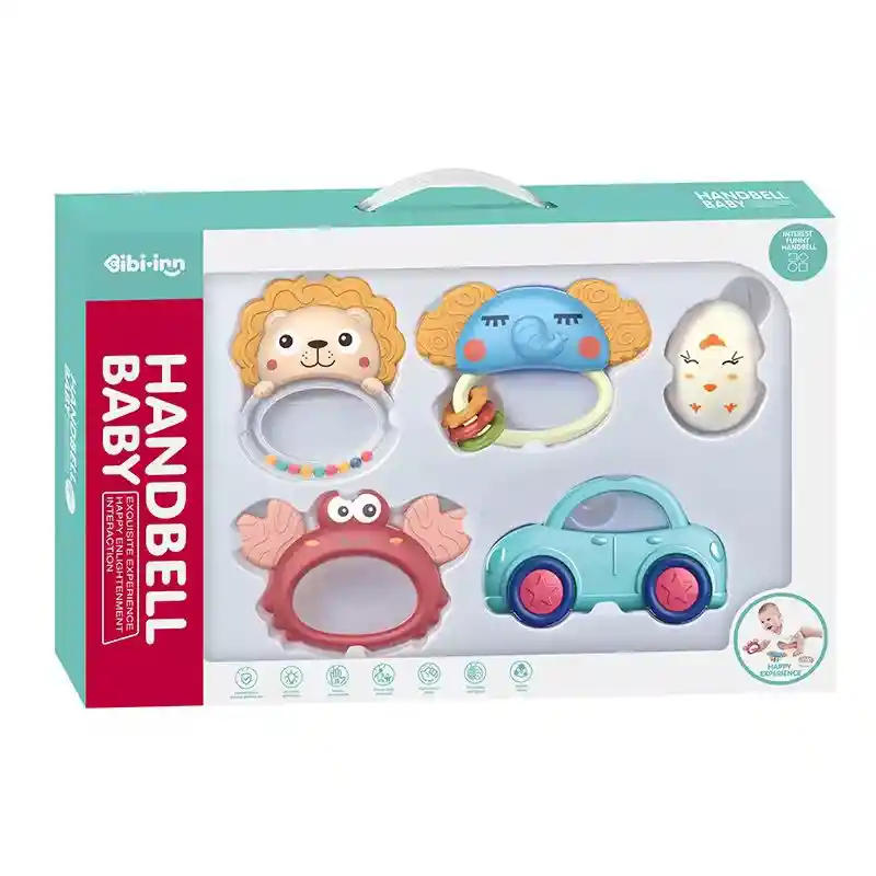 Set completo diseñado para la estimulación y el entretenimiento del bebé. Incluye 5 piezas entre sonajeros y mordedores, elaborados en materiales seguros y libres de BPA, ideales para calmar las encías en la etapa de dentición mientras desarrollan la motricidad y los sentidos. Características principales: Incluye 5 sonajeros y mordedores de diferentes formas y colores. Material seguro, libre de BPA. Favorece la estimulación visual, auditiva y táctil. Ayuda a calmar las molestias de la dentición. Caja práctica para organizar y guardar. Especificaciones: Contenido: 5 piezas + caja de almacenamiento. Material: plástico y silicona de grado alimenticio. Edad recomendada: desde 3 meses.
