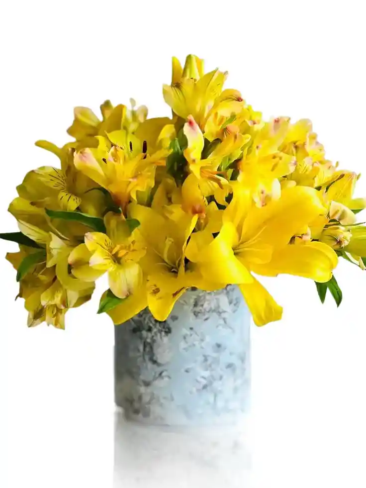 Caja redonda de lirios con astromelias. La flor puede ser sustituida dependiendo la disponibilidad de color y del producto “Mensaje Personalizado” máximo de 30 caracteres (Dejar el mensaje en el chat, los comentarios no se previsualizan para la tienda por lo que si se dejan allí no podrá ser incluido).